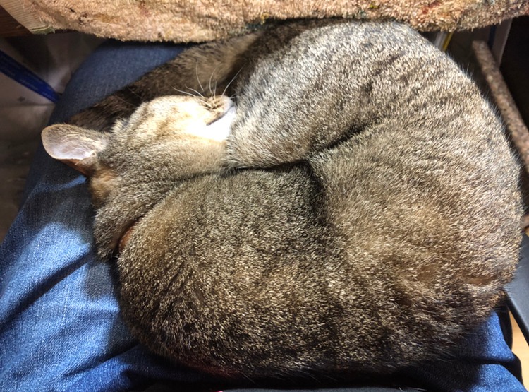 作業中の私の膝の上でサクラ嬢が寝ております。