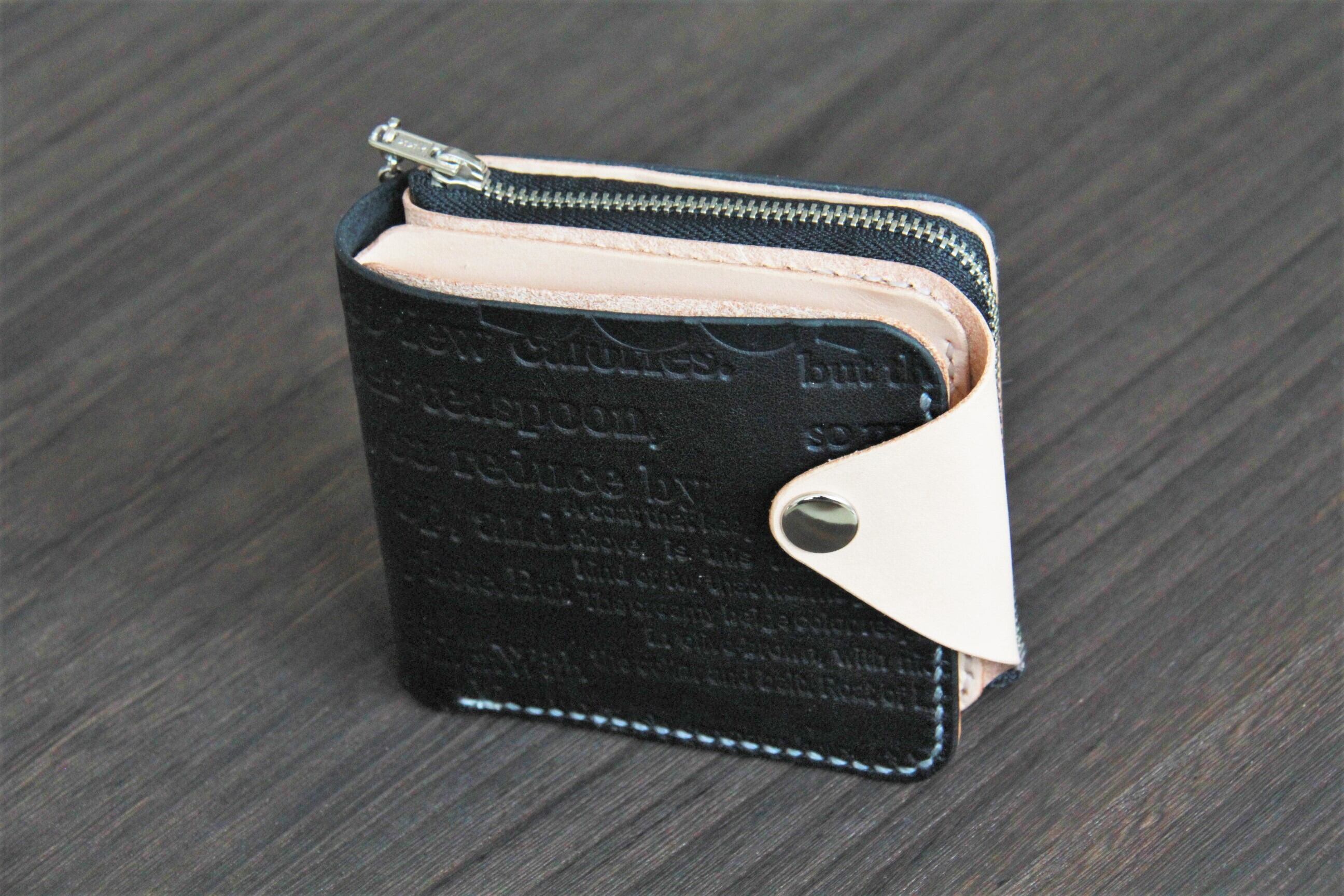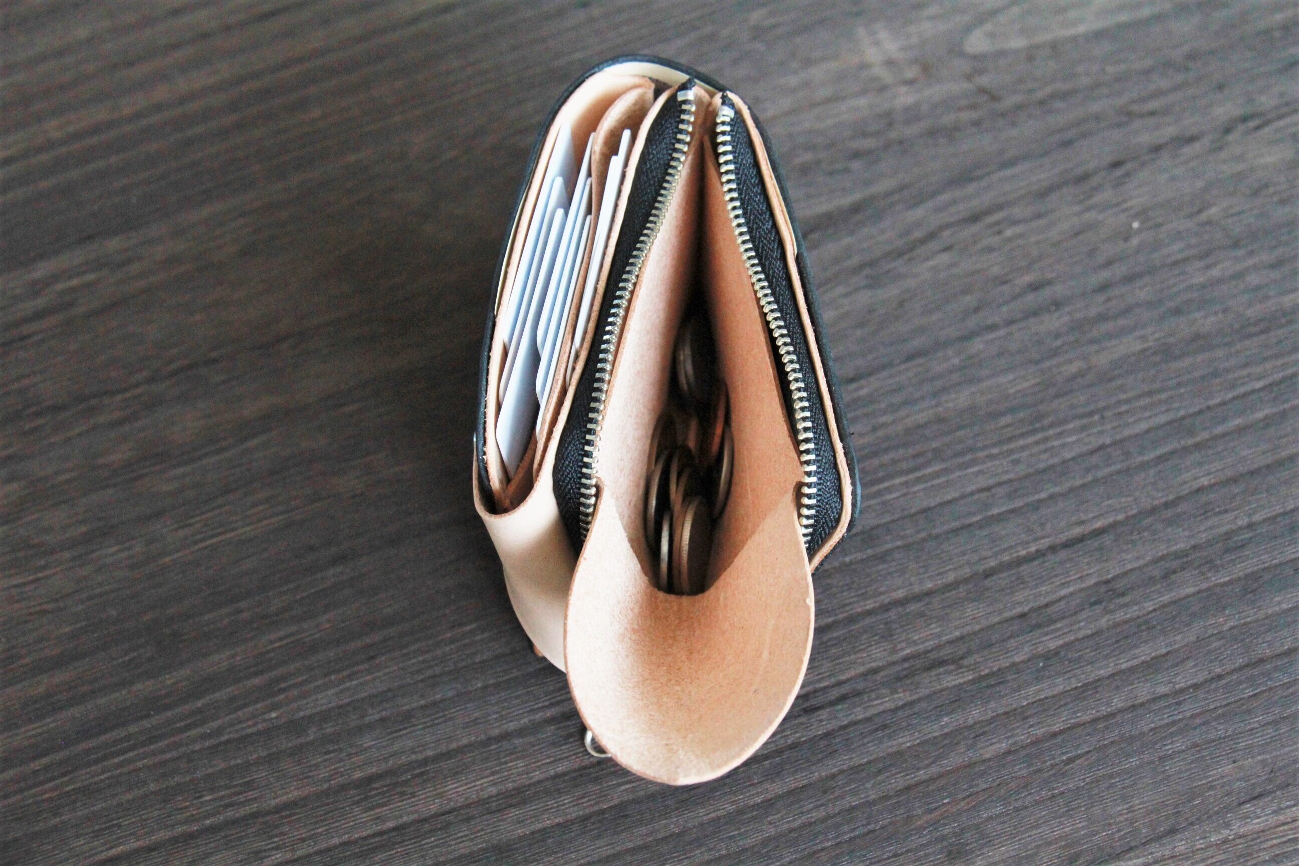 外側にL字ジッパーのポケットをつけているので財布を広げなくてもよく使うカードやお札数枚、コインが直ぐに取り出せるようになっています。