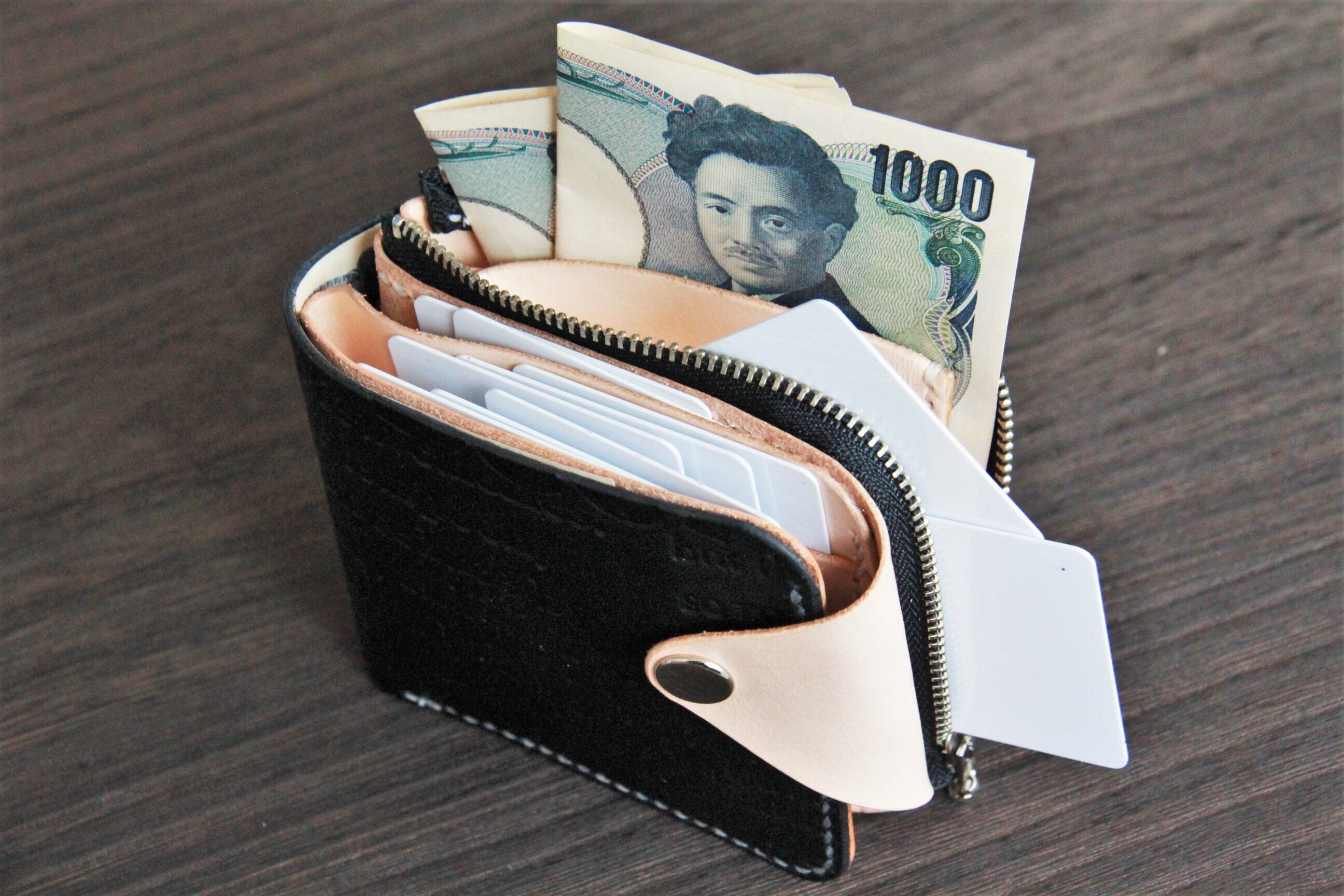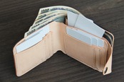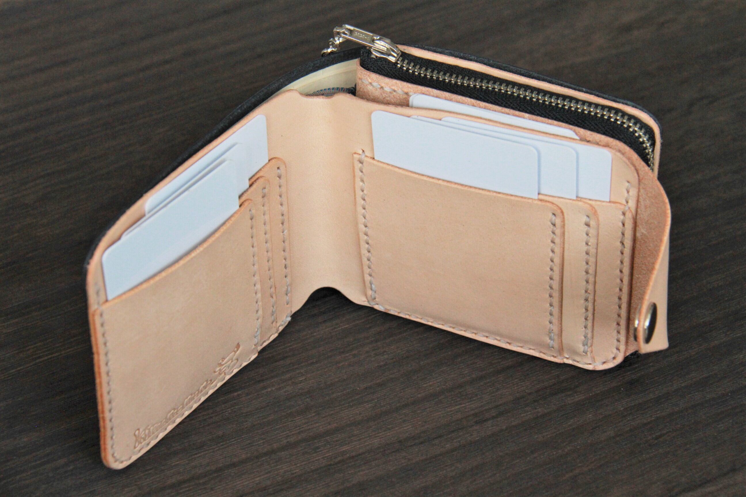 革工房kimamamonoらしい手縫いの二つ折り財布にする為に今回は収納力に重点を置いてみました。
