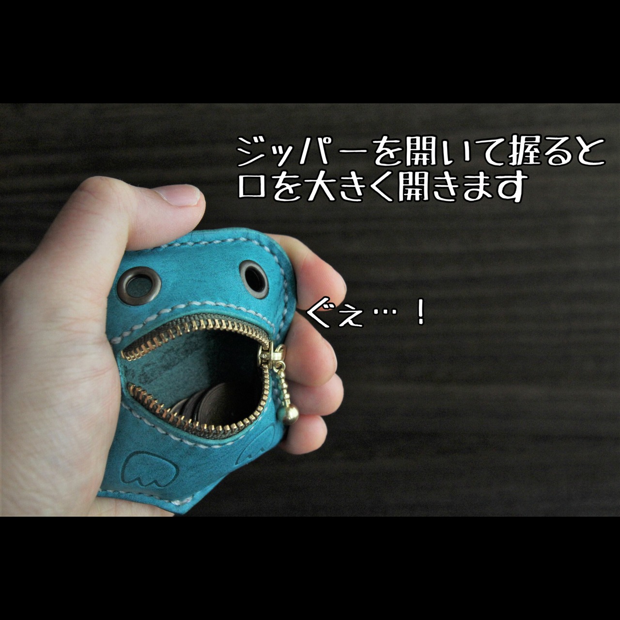 捕まえてジッパーを開けて握ると口を開きます。